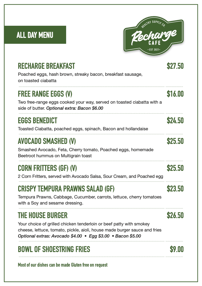 Our large and uplifting cafe setting enhances the dining experience, making us one of the go-to places to eat in Clyde. Whether it's the praises for our 'amazing food' or the uplifting ambiance, Recharge Bar is dedicated to bringing you the best, with every sip and bite.